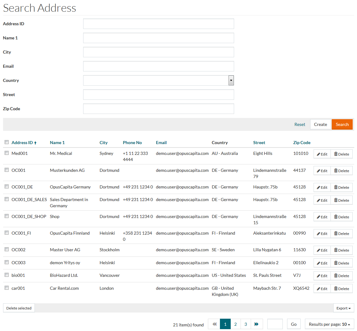 On the Address search page, click the Create button to add or create new address. This opens the Address Editor.