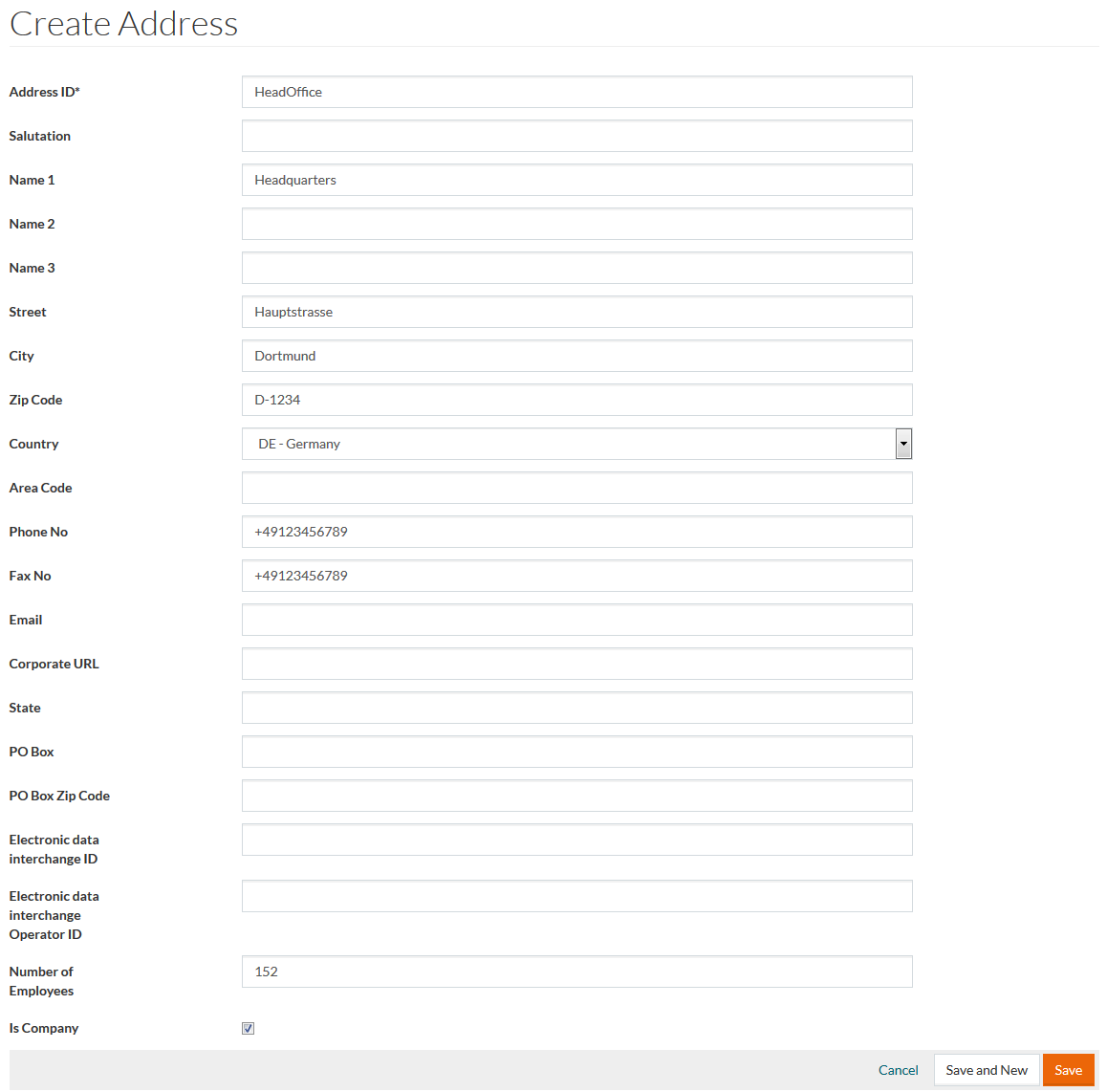 Fill in the relevant details and click Save to save an address after editing, Save and New to proceed with a new address and Cancel to return to the search page.