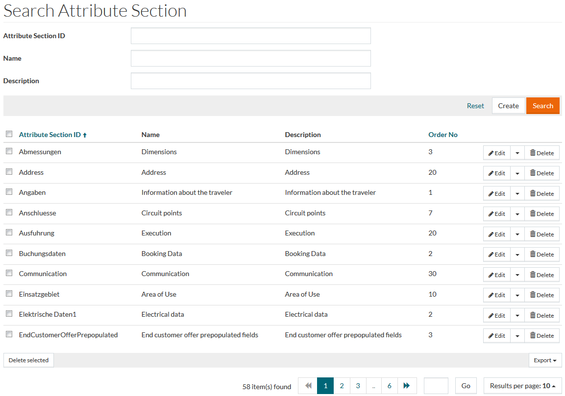 Use the Attribute Section editor to create attribute sections for further usage. In particular, sections group the attributes assigned to a particular section for their display in PIM and OPC.
