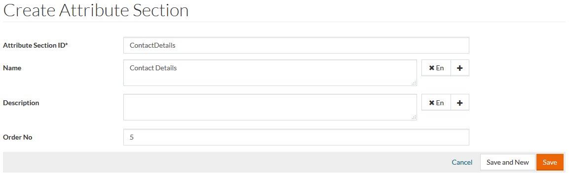 Enter the Attribute Section ID into the appropriate field, which is mandatory. Optionally enter attribute section Name and Description. It is possible to add Names and Descriptions in multiple languages. If required, enter Order No.