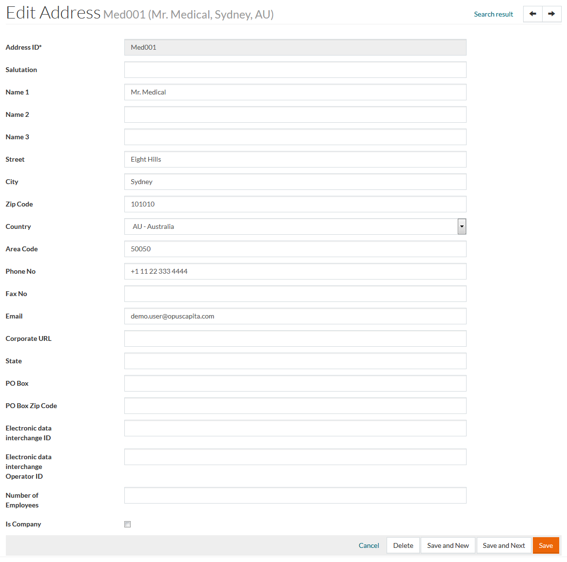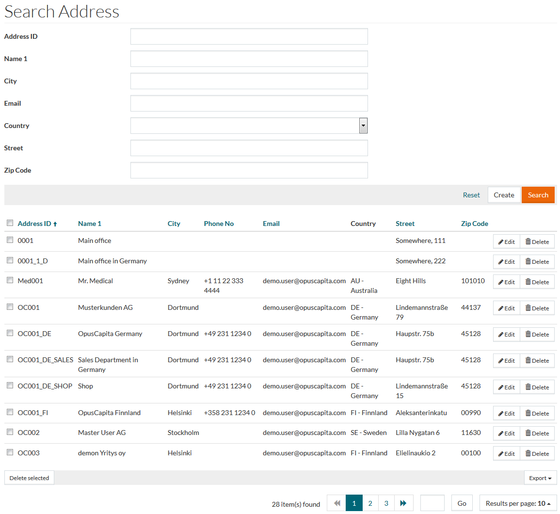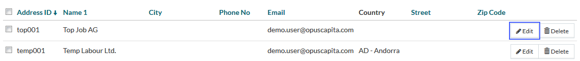 Basic actions available in every CRUD (Create-Read-Update-Delete) editor are listed on this page. The Address editor is taken as an example.