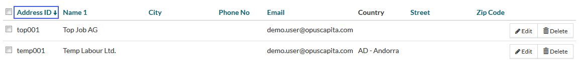 E.g. on the screen above, the search results are sorted by the Address ID in the ascending order (indicated by ). Sorting in descending order is indicated by the icon.