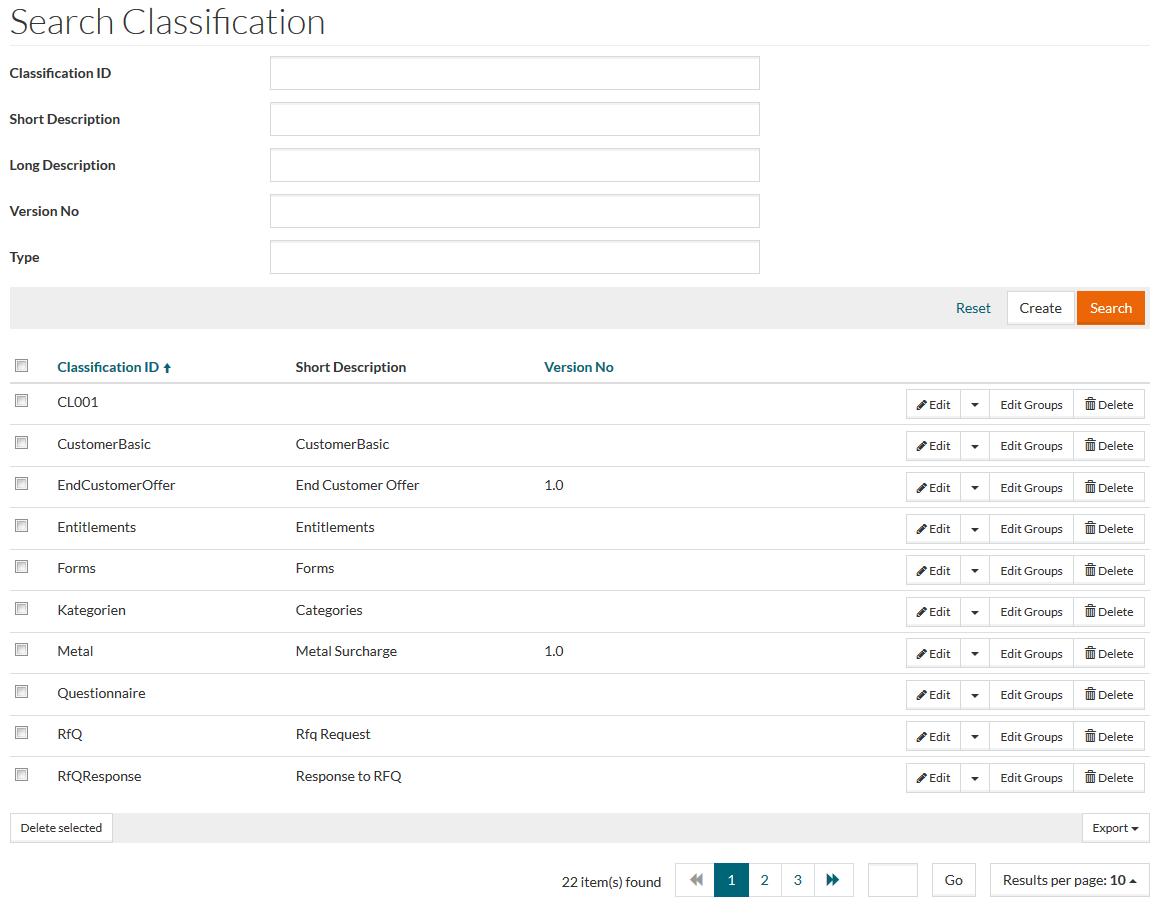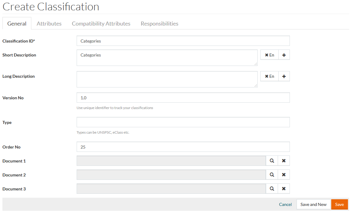 On the General tab enter the Classification ID (mandatory field), Short Description, Long Description - click to add descriptions in an additional language and to delete them, Version No (unique number to track classifications), Type of classification (like UNSPSC or eClass) and the Order No.