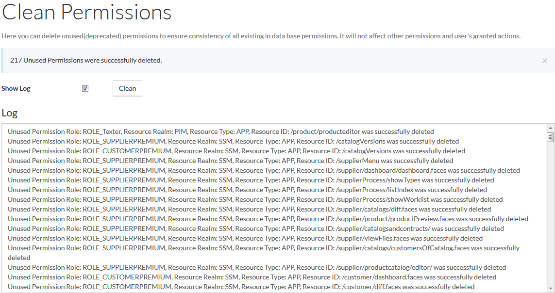 Select the Show Log check box in case you want the view the log, click the Clean button to clean the deprecated permissions.