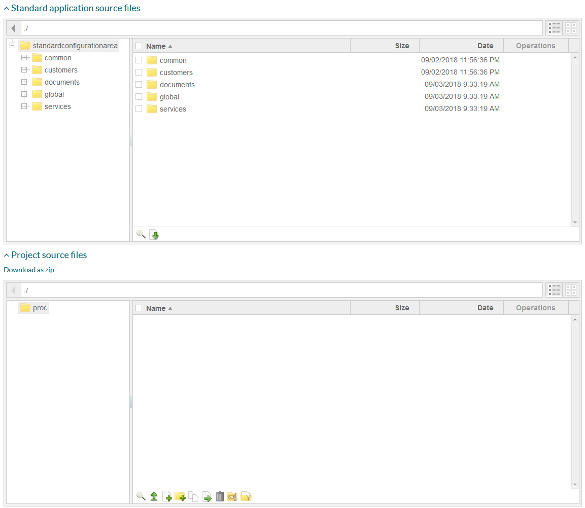- Select the files that need to be customized by selecting the appropriate check boxes on the right hand from the filenames in the Standard application source files section and click , this will copy the selected files to the corresponding directory in the Project source files section. Now you can customize them using or download, change and re-upload the files.
