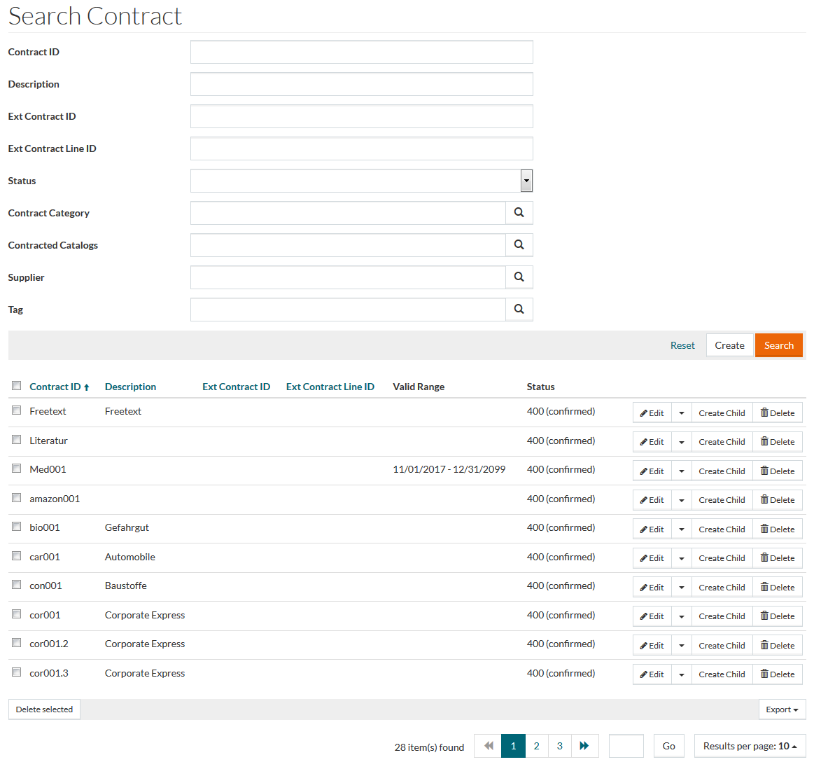 In case you wan to create a sub-contract of a current Contract click the Create Child on the Search result page or on the Contract editor page.