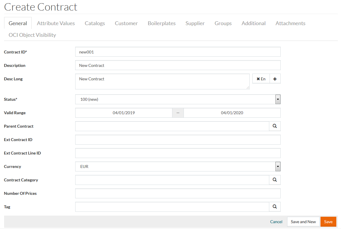 Click Save to save a newly created contract. This also enables the Attribute Values, Catalogs, Customer, Boilerplates, Supplier, Groups and Additional tabs of the Contract Editor. All associated/related Contract information is provided here. To cancel, click Cancel.