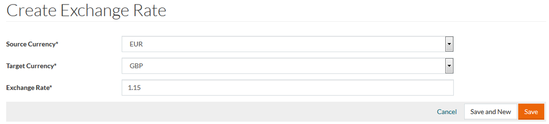 Click Save to save the data. Click Save and New to save the changes and proceed creating a new conversion rate. Click Cancel to cancel.