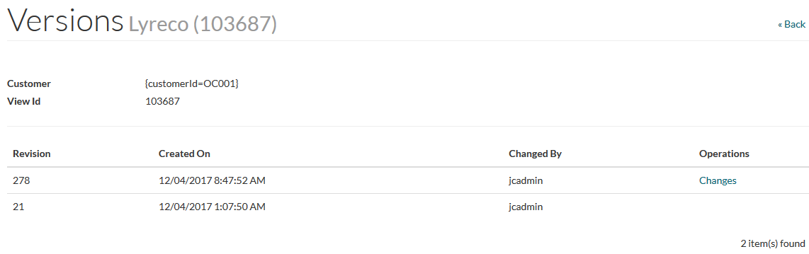 Select the Revisions option from the Edit drop-down list on the search results page or click the Revisions button in the customer view editor to get the list of revisions of the customer review entry.