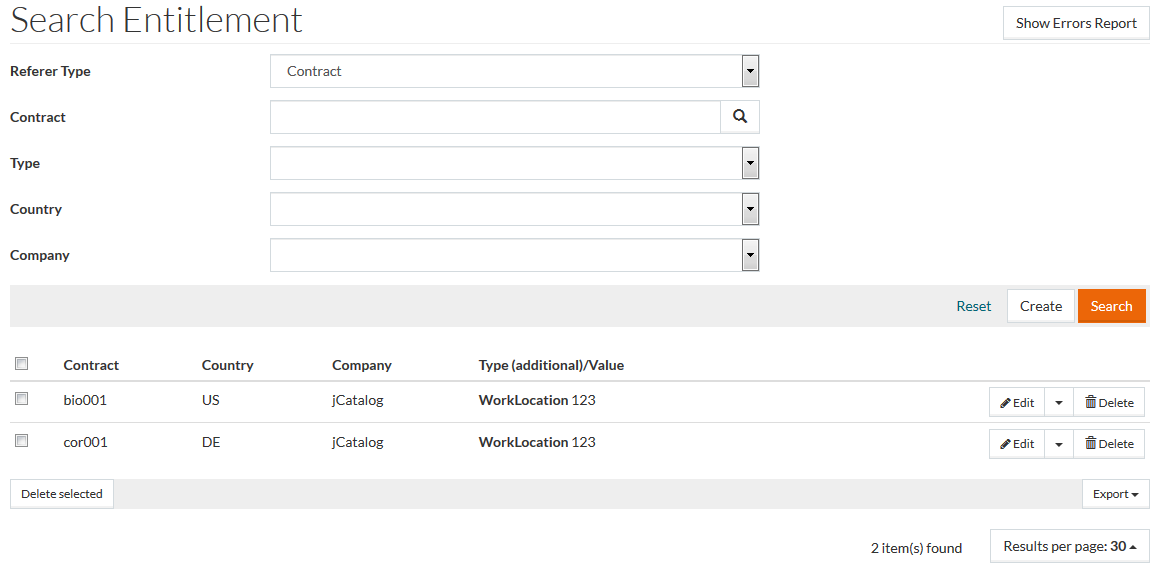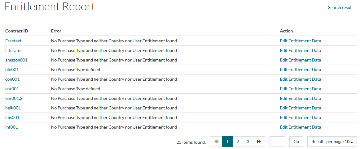 For details of contracts with missing or incorrect Entitlement data, refer to the Entitlement Report. To view this report, use the Show Errors Report button located in the upper-right corner on the Entitlements search page.