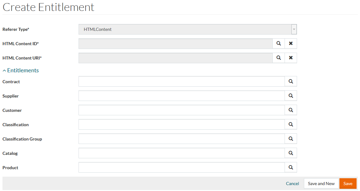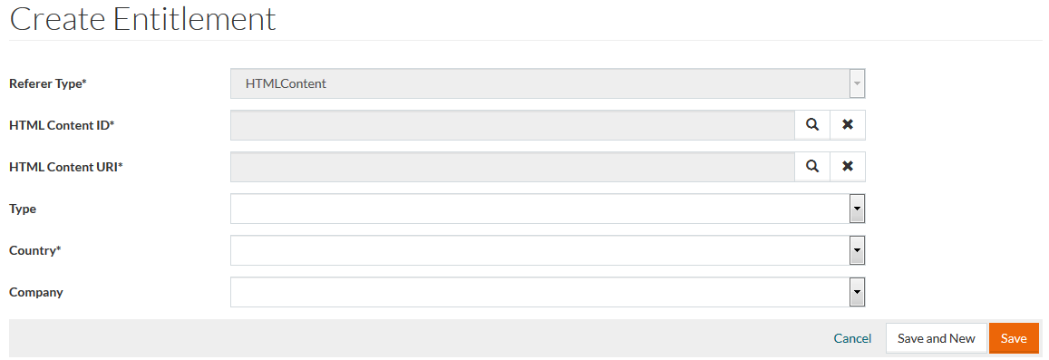 Complete the form and click Save to save the created Entitlement, Save and New to save the entitlement and start a new one or Cancel to return to the search page.