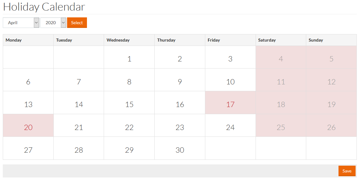 The Holiday Calendar allows marking public holidays as non-working days. Saturdays and Sundays are marked by default.