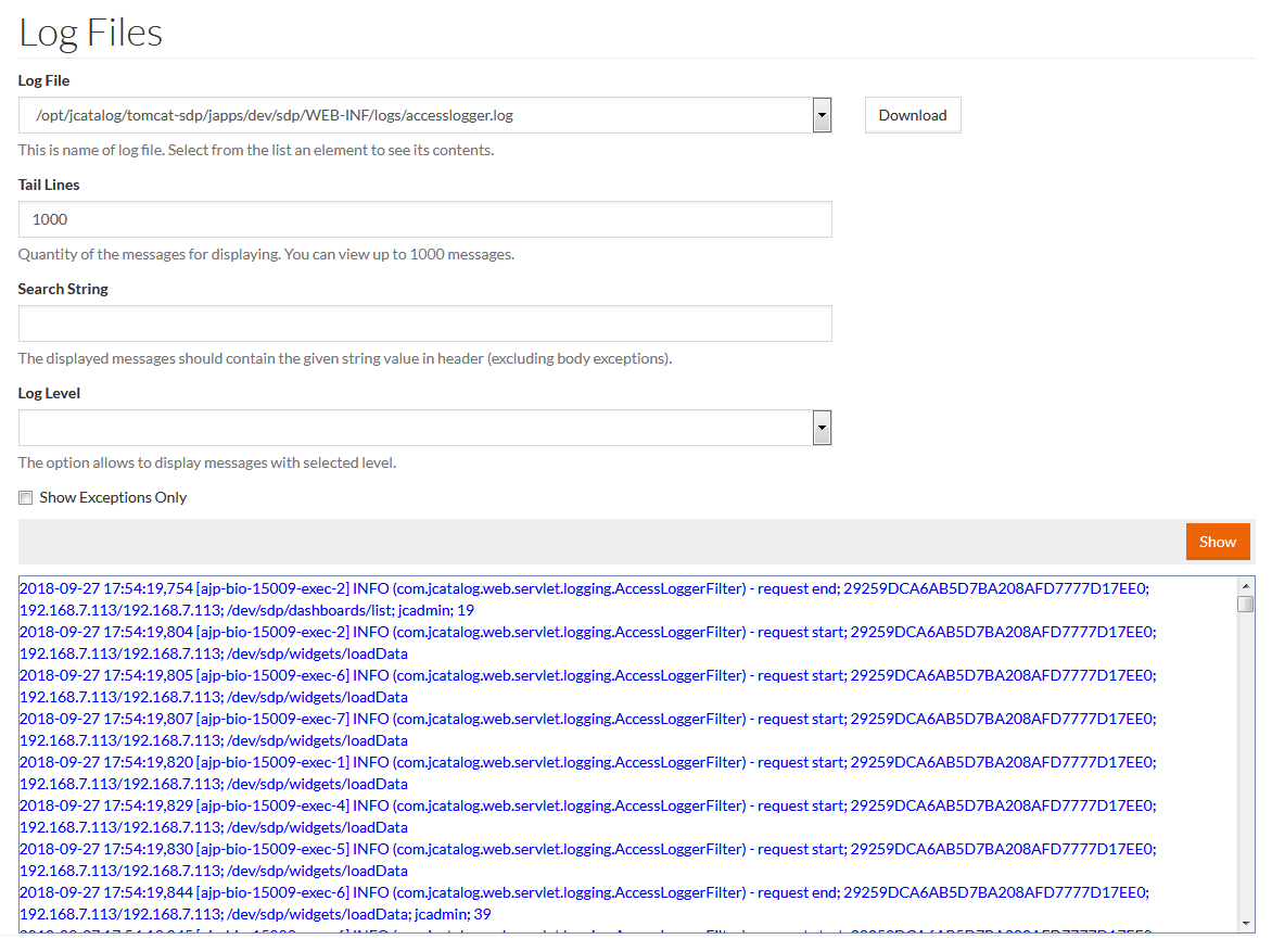 - Log Level - results can be filtered for messages like DEBUG, INFO, WARN, ERROR. Select the desired level from the drop down menu. Messages for all levels are displayed if a log level is not selected.