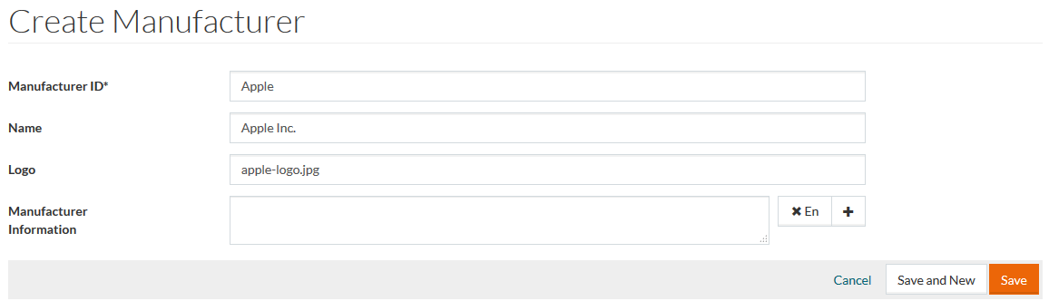 Click Save to save, Save and New to save the manufacturer entry and proceed creating a new one. Click Cancel to cancel.