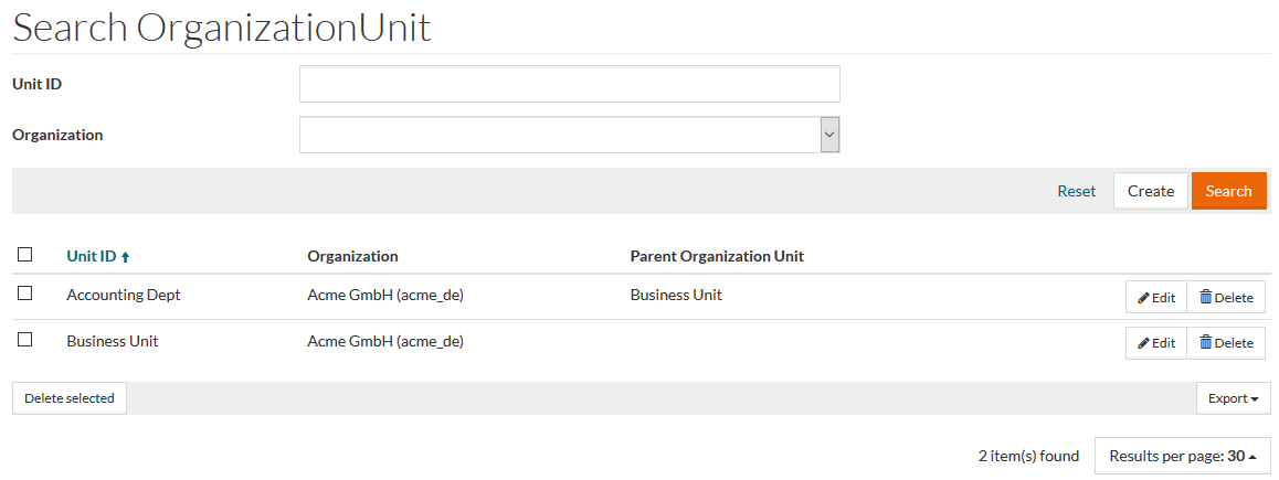See the Basic Actions page for more info on standard actions (search, sort, edit, delete etc.) with the Organization Units.