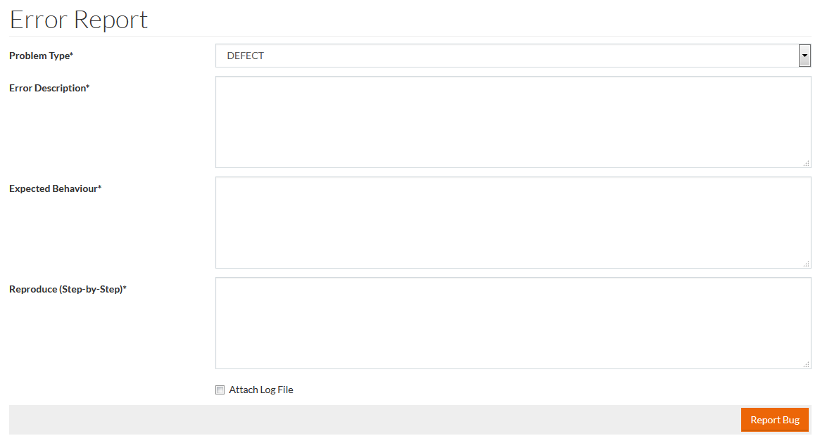 Use the Report Bug option to create a standard error report in case of encountering an error.