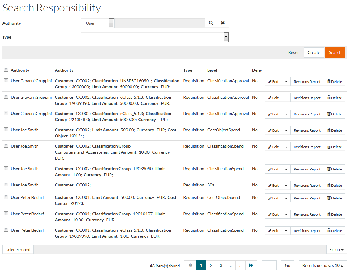 To open the Responsibility search page in the User and Master Data application, click Authorization menu -> Responsibilities menu item.