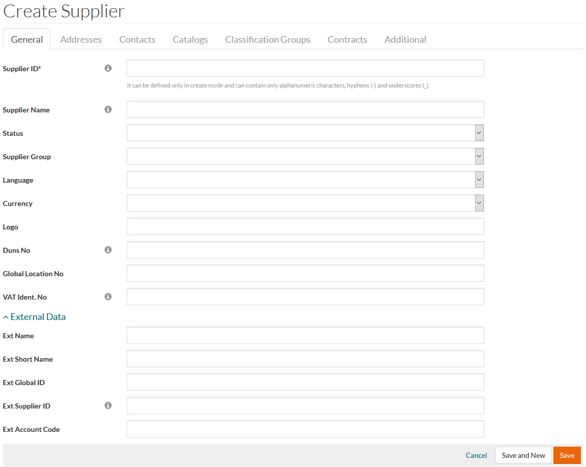 After confirming creation, other tabs of the editor namely - Addresses, Contacts, Catalogs, Classification Groups, Contracts and Additional - are available.