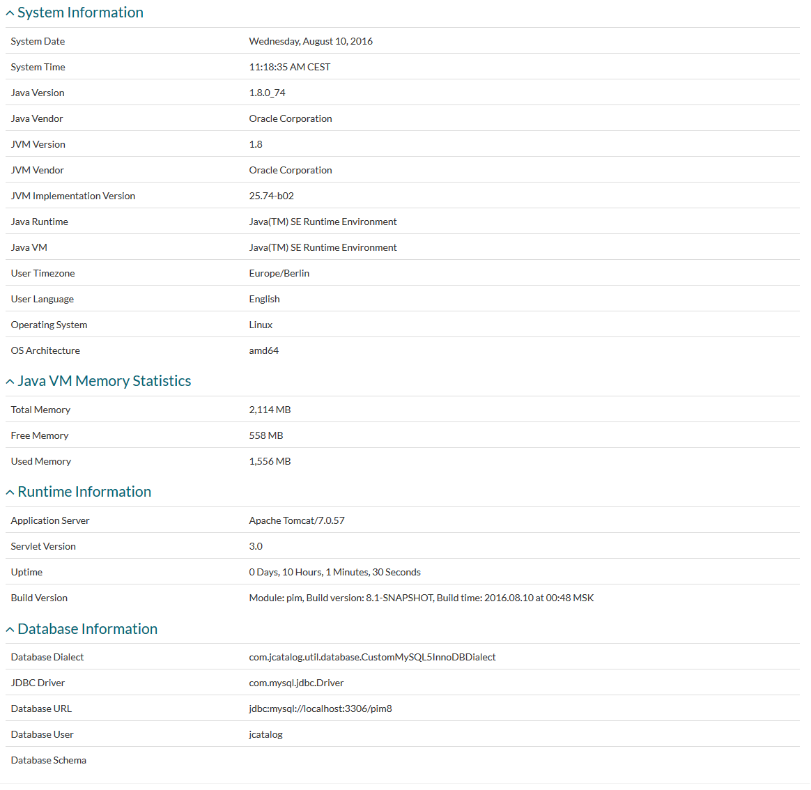 This functionality offers an overview of system-related information and database connection parameters that are used to run the application. The System Information page displays: