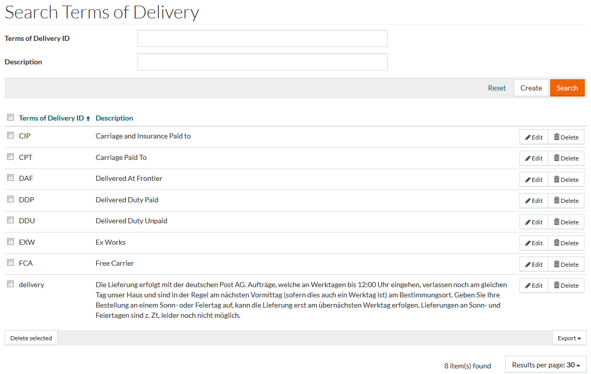 To open the Search Terms of Delivery page, select Master Data from the main menu and then Terms of Delivery (in the Terms of Business section).