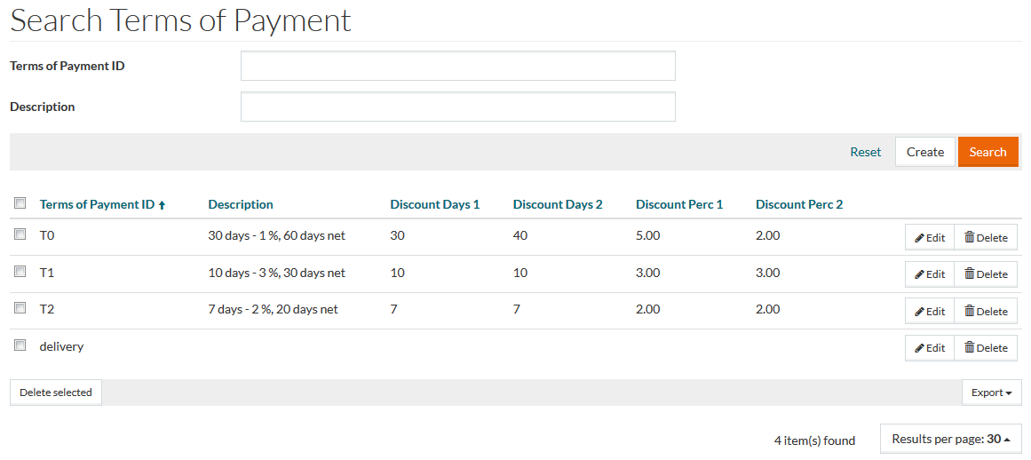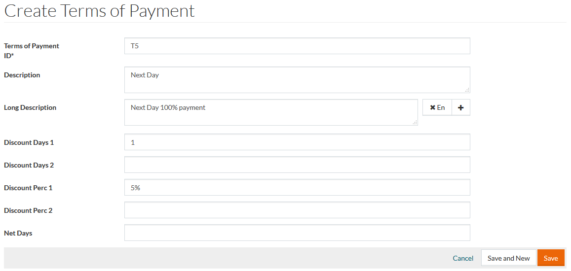 Enter individual payment term in the mandatory Terms of Payment ID field. An informative description can be provided in the Description field - e.g. "5 days - 2 %, 5 days net" and Long Description (can be multi-linguage). Enter Discount Days 1, Discount Days 2, Discount Percentage 1, Discount Percentage 2 and Net Days if required.