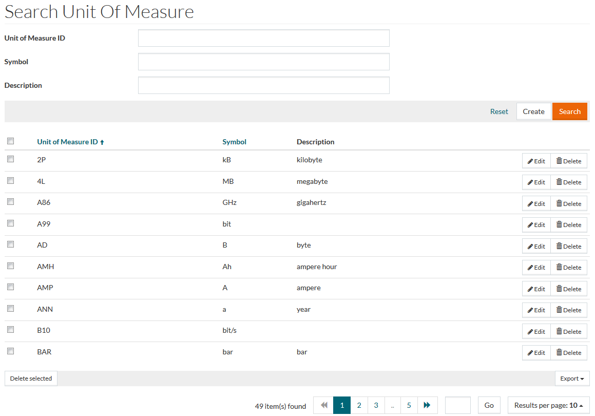 The metric Measurement system according to ISO and the international Unit system SI (International System of Units) according to ISO will be used in application. The international common Units of Measure, apart from its general code, can also have different terms in different languages. In order to display these language-dependent terms, they have to be created here.