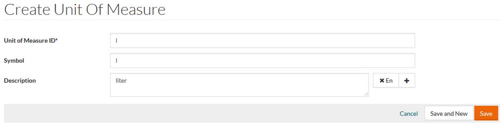 Click Save to save the data. Click Save and New to save the changes and proceed creating a new unit of measure. Click Cancel to cancel.