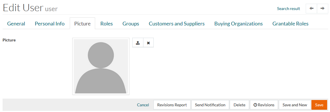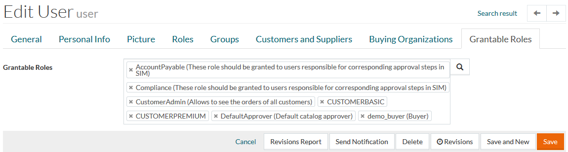 Upon clicking the Save button, other tabs namely Personal Info, Roles, Groups, Customers and Suppliers, Buying Organizations and Grantable Roles become available.