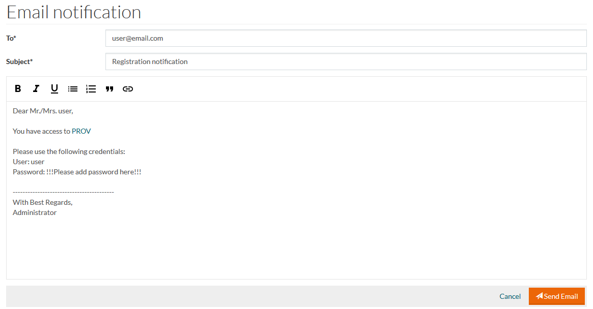 After the user is created, you can send a registration notification with the credentials for the user to log into the relevant application.