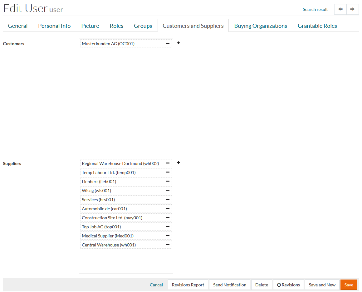 The list of available suppliers and customers for assignment is limited by the Supplier/Customer assignments of the user who creates/edits the current user info.