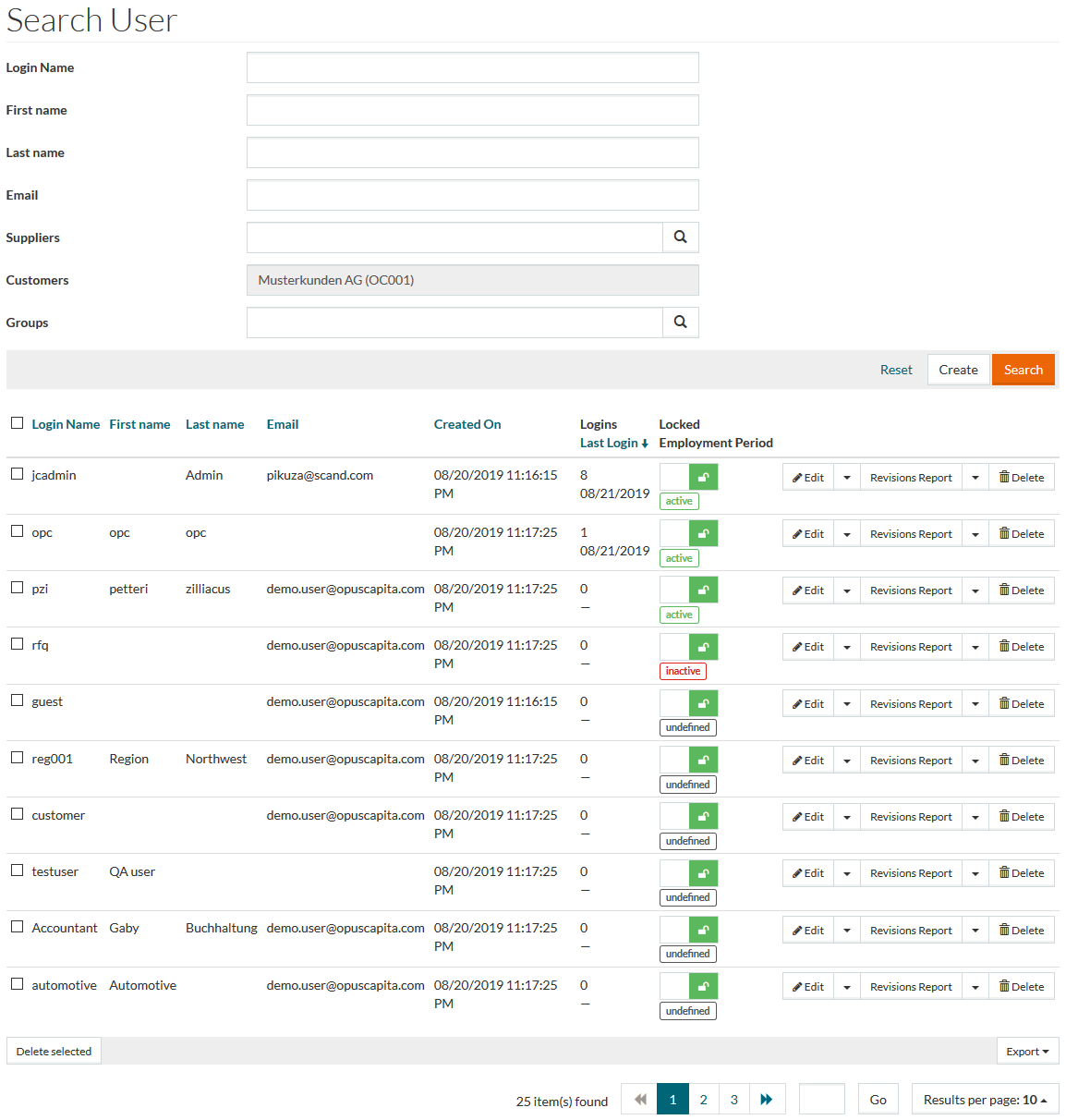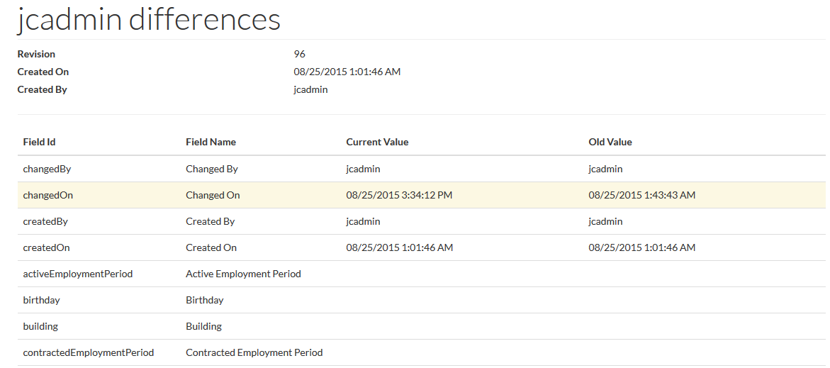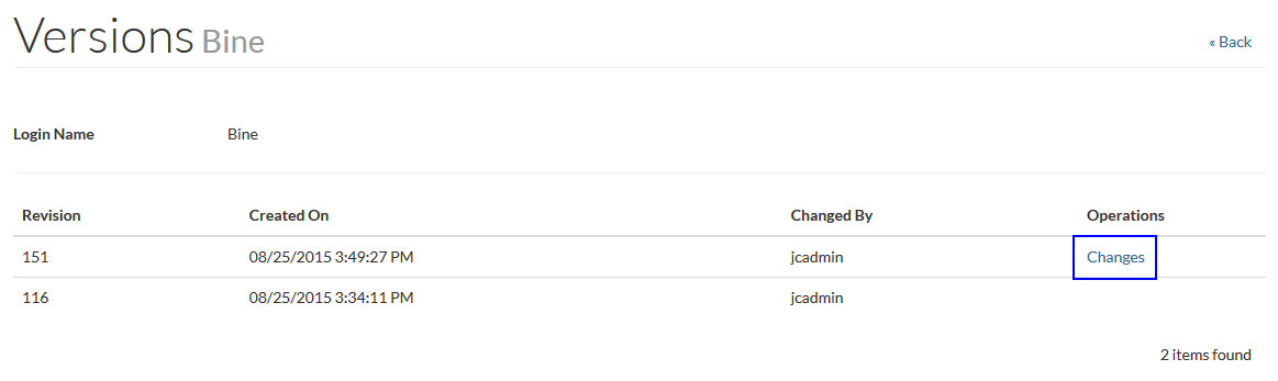 You can open the Catalog User Revisions Report by clicking the Revisions Report button in the user search result table or in the user editor. See the Catalog User Revisions Report page for more details.